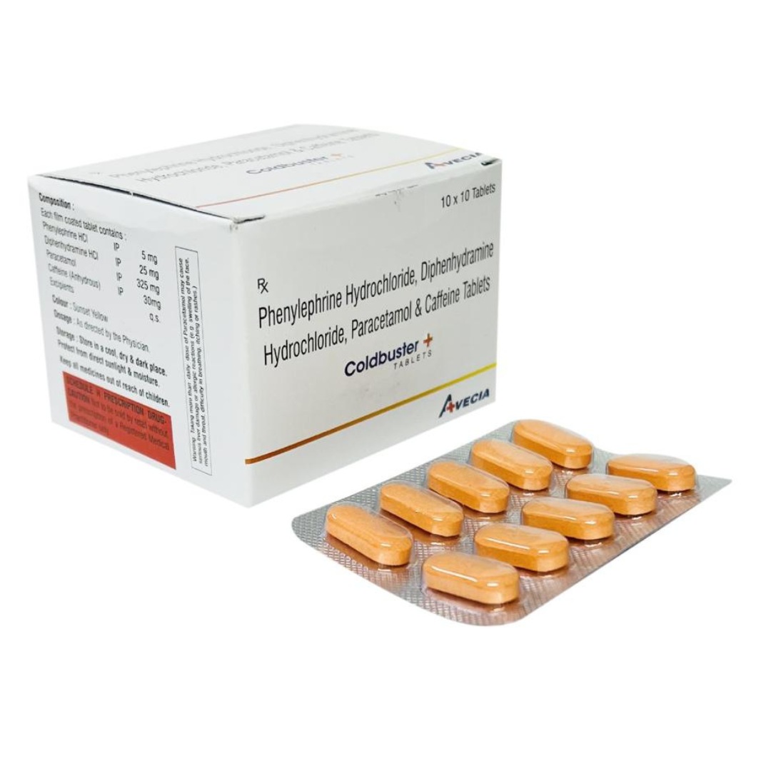 COLDBUSTER+ Tablets are a highly effective combination medicine designed to provide fast and comprehensive relief from symptoms of the common cold, flu, allergic rhinitis, sinus congestion, and related respiratory infections. This unique formulation brings together four active ingredients – Phenylephrine Hydrochloride, Diphenhydramine Hydrochloride, Paracetamol, and Caffeine – in a single, easy-to-take tablet form. Each ingredient serves a distinct purpose to alleviate multiple discomforts such as nasal congestion, runny nose, sneezing, body aches, fever, and fatigue, ensuring faster recovery and improved comfort.