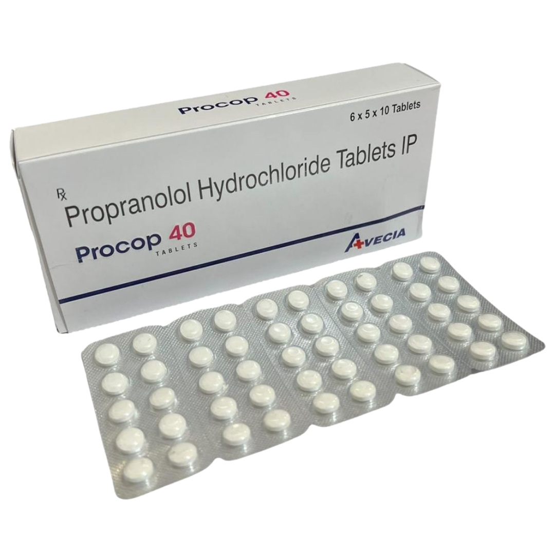 PROCOP 40 contains Propranolol Hydrochloride 40 mg, a non-selective beta-adrenergic blocker that works by reducing the heart rate and blood pressure, thereby decreasing the workload on the heart. It is commonly prescribed for hypertension, angina, arrhythmias, and other cardiovascular conditions.