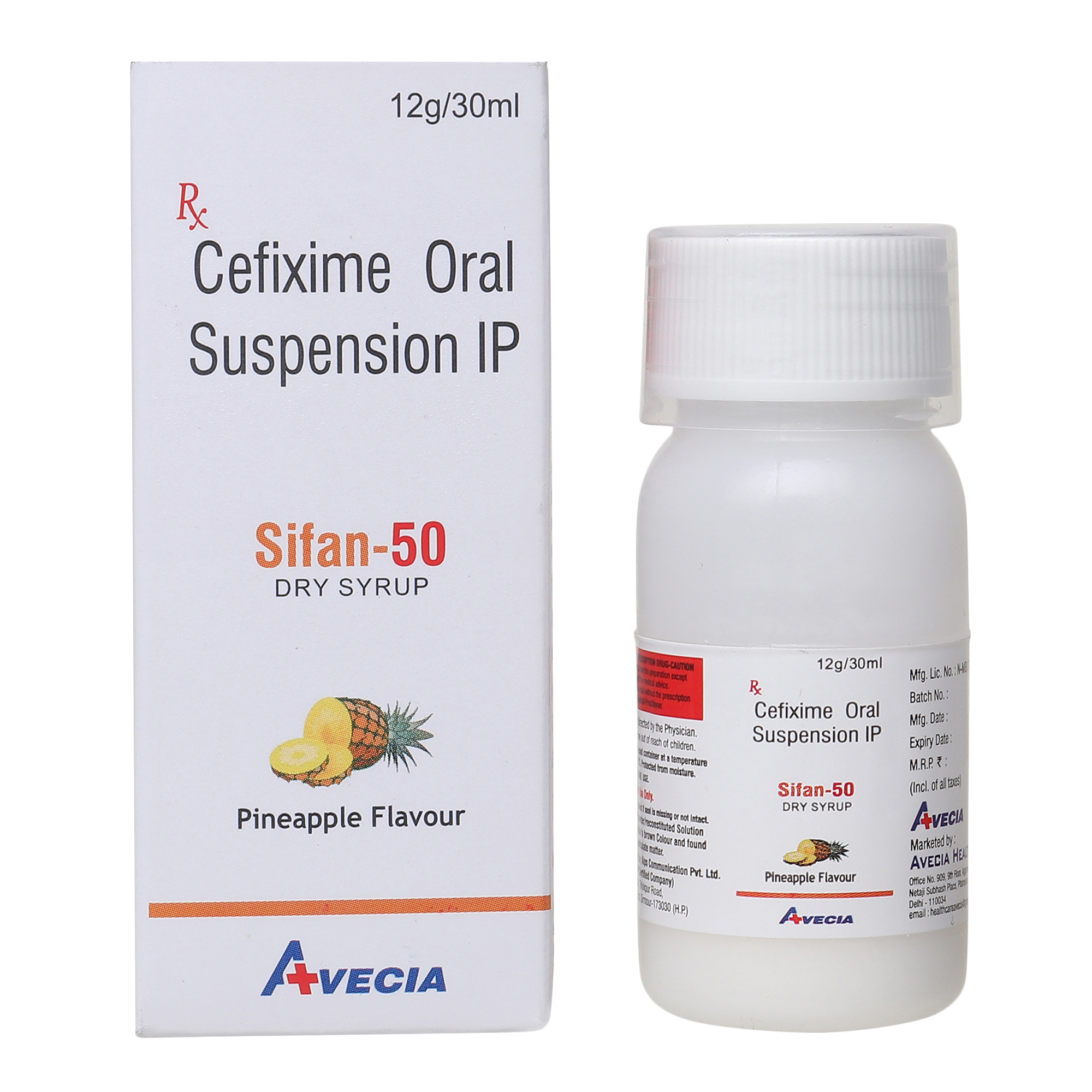 Sifan-50 is a high-quality pediatric antibiotic formulation containing Cefixime 50 mg per 5 ml of dry syrup, designed to combat a wide range of bacterial infections in children. Belonging to the third-generation cephalosporin class of antibiotics, Sifan-50 offers broad-spectrum activity against gram-positive and gram-negative bacteria. This dry syrup is formulated with child-friendly flavoring agents to ensure better palatability and adherence to treatment, making it a trusted solution for pediatric bacterial infections.