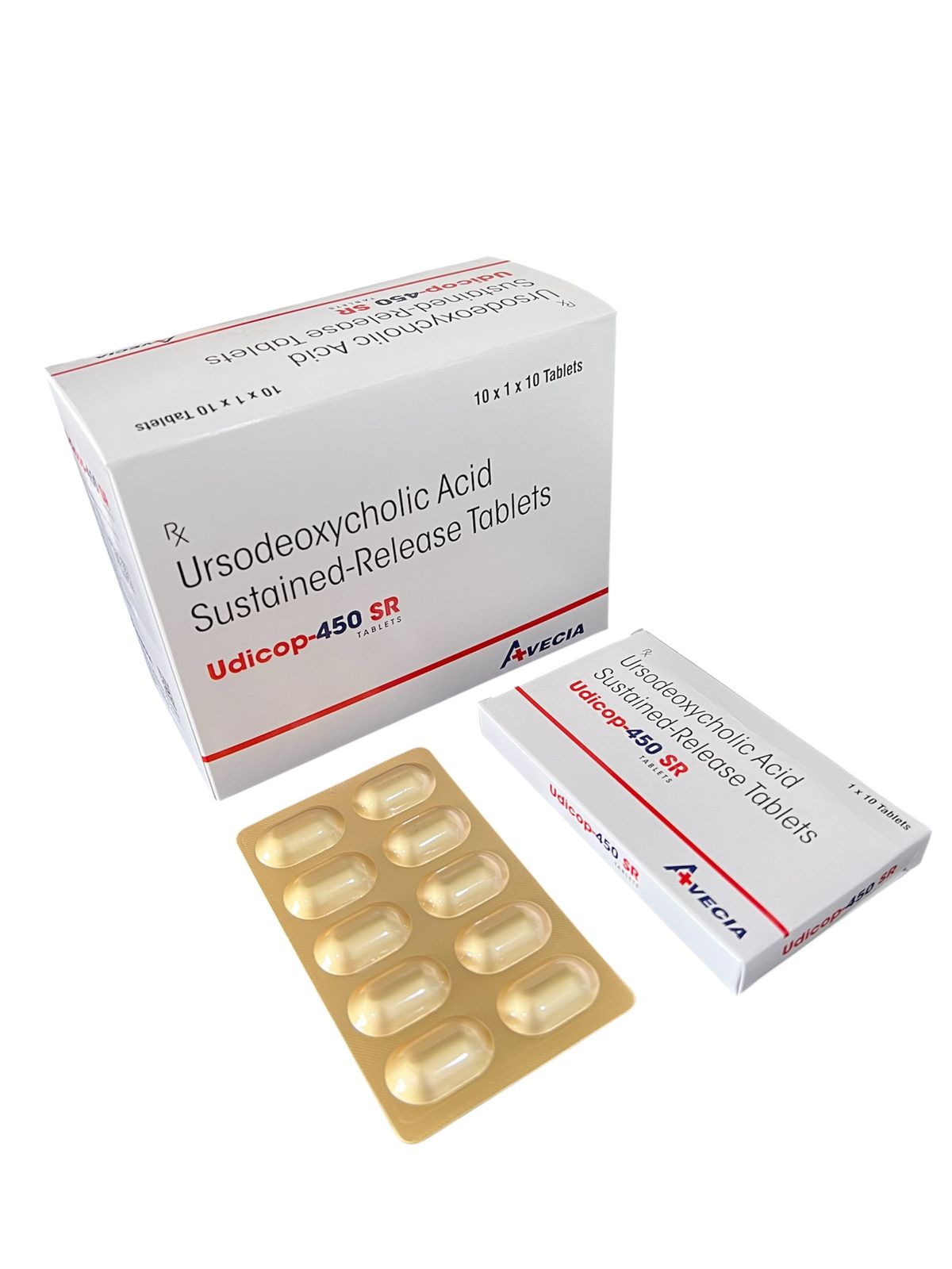 Udicop 450 SR works by modifying the composition of bile. Ursodeoxycholic acid replaces toxic bile salts, making bile less harmful to liver cells. It also promotes bile flow, prevents bile acid-induced apoptosis of hepatocytes, and facilitates the excretion of bile acids. The SR (Sustained Release) formulation ensures that therapeutic levels of UDCA are maintained in the bloodstream over an extended period, improving clinical outcomes.